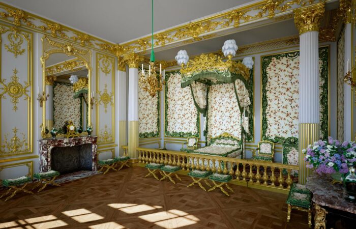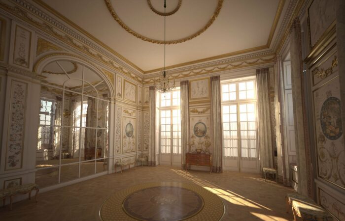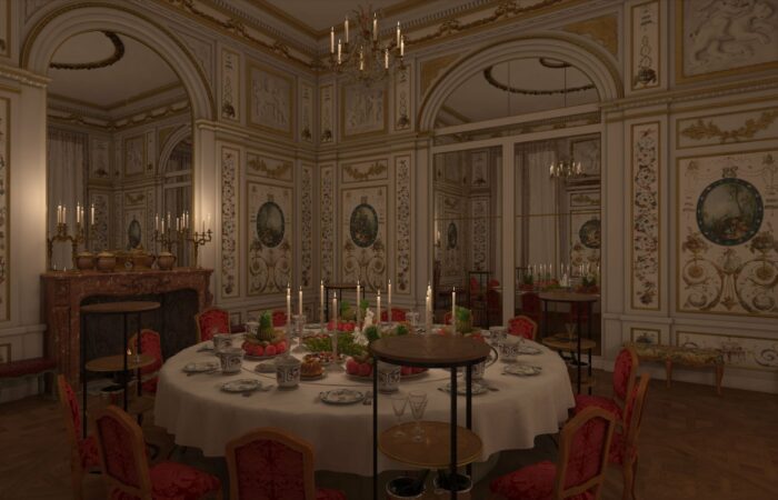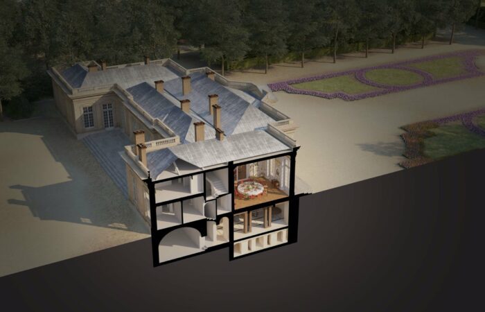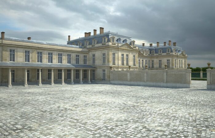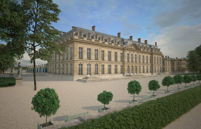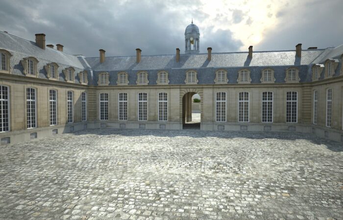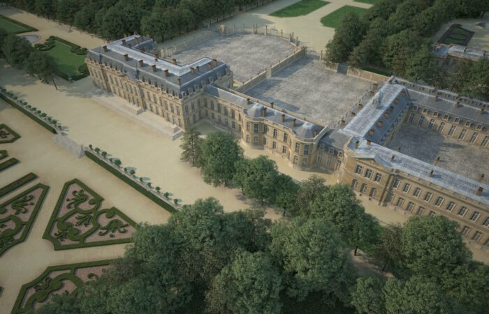 Pour la première phase, la réalisation s’est portée sur la reconstitution 3D des extérieurs du château avant et après transformation de Louis XV. Elle a donné lieu à la réalisation d’un film destiné au site internet de la ville.